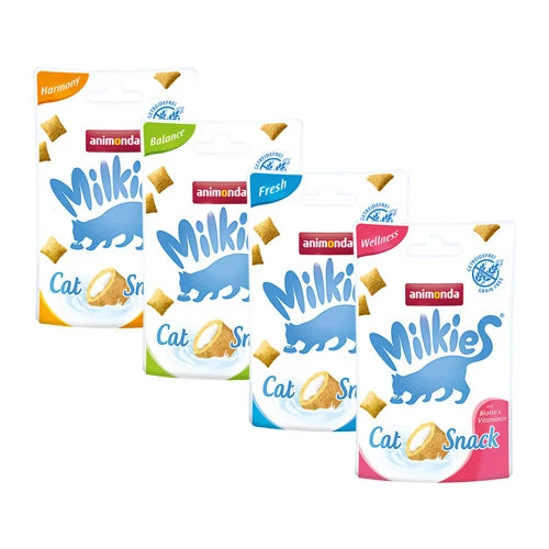 - Animonda Milkies Cat Snack – Balance: meat and animal byproducts (poultry), vegetables, oils and fats (including 2% salmon oil), vegetable protein extracts, vegetable byproducts, milk and milk products and minerals.