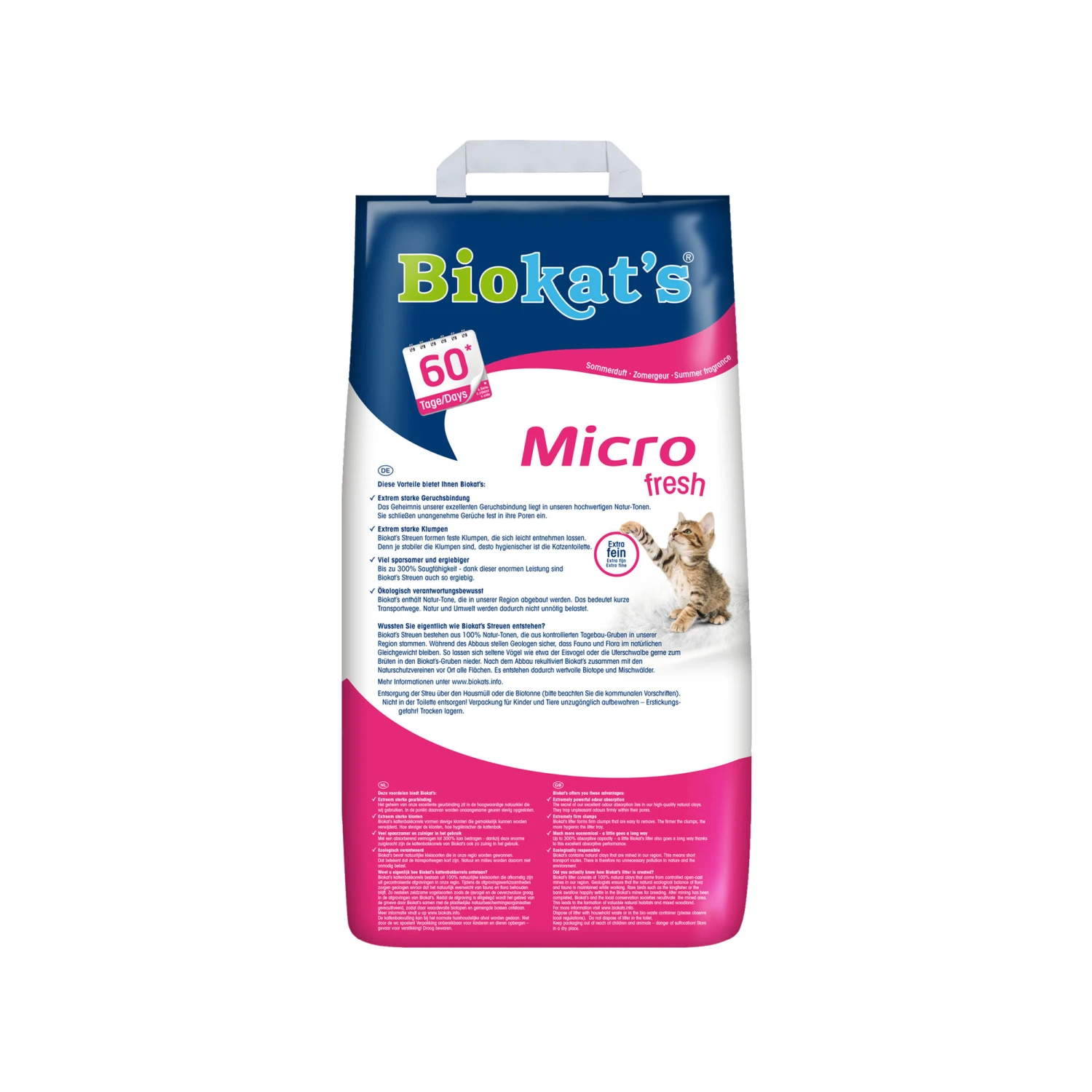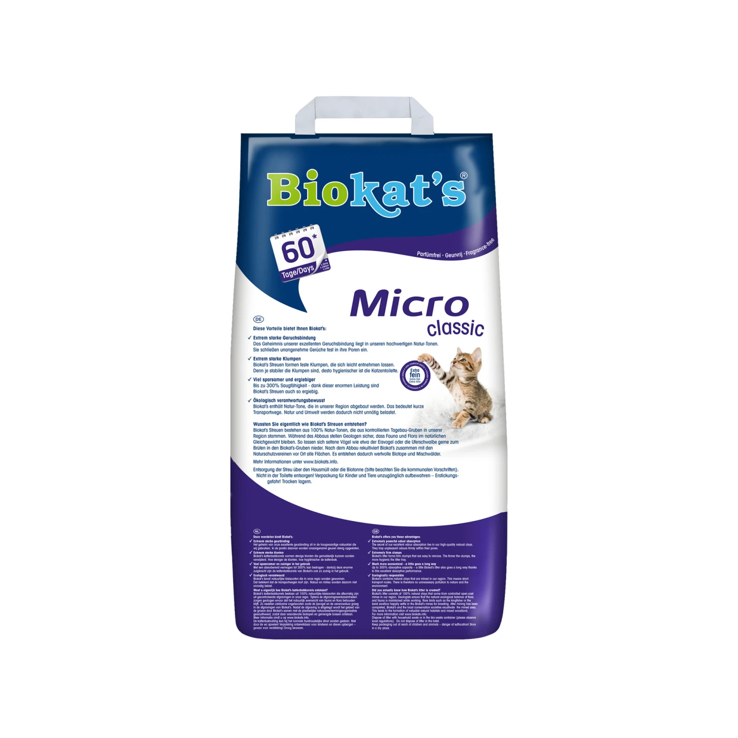 Biokat’s Micro is a very fine grain natural clay grain that absorbs well. The litter is virtually dust free and odourless. Thanks to the fine grain this grit is ideal for use with mesh bottomed litter boxes. The natural clay absorbs urine fast and forms solid clumps that can be easily scooped out. Biokat’s Micro is an efficient cat litter; 1 litre of Biokat’s Micro binds at least 3 litres of liquid. Removing clumps daily makes one bag last longer.