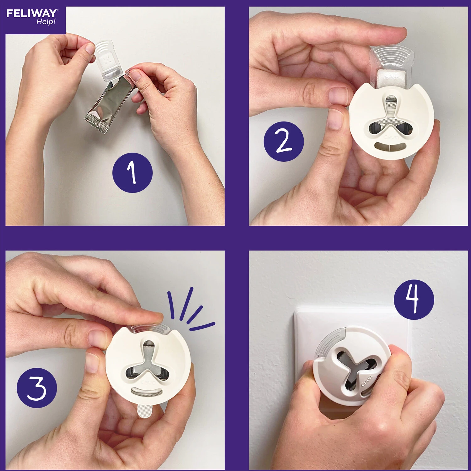 Open the cartridge packaging and place it in the special evaporator. Then plug in the evaporator. Do this in the room where your cat is most often. When doing so, make sure the evaporator hangs freely. Therefore, do not place it under shelves or behind curtains, furniture and doors.