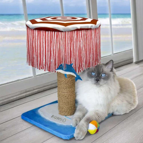 The KONG Play Spaces Catbana is the perfect toy to add to your cat’s toy collection. It’s important to provide stimuli for your cat to develop his or her hunting instincts. Scratching and playing also help cats get rid of their daily energy. The KONG Play Spaces CATbana combines the best of scratching posts with the best of toys. The scratching post has different textures to attract your cat’s attention and is made with natural materials to stimulate correct scratching behaviour. The umbrella has frills for you cat to play with, swat at or hide behind. There are also two small dolphin-shaped toys hanging from the umbrella, for your cat to jump at, play with and swat at. One thing is sure: the KONG Play Spaces CATbana tickles all your cat’s senses during play.