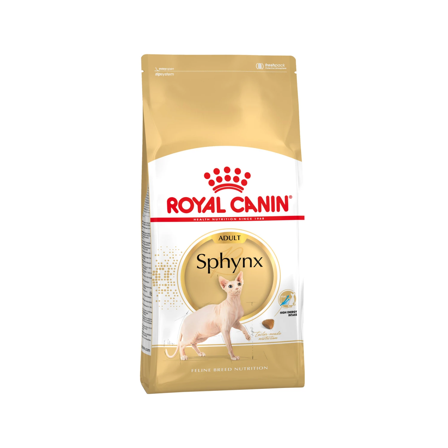 Royal Canin Sphynx Adult is delicious dry food for your adult Sphynx cat between 1 and 12 years old. This food supports your adult Sphynx cat’s urinary tract and heart. Additionally, this food nourishes and protects the unique dry skin of Sphynx cats. The energy content of the food has been specially adjusted to your purebred cat’s needs. The cat kibble has been specially designed for your Sphynx cat’s jaw size.
